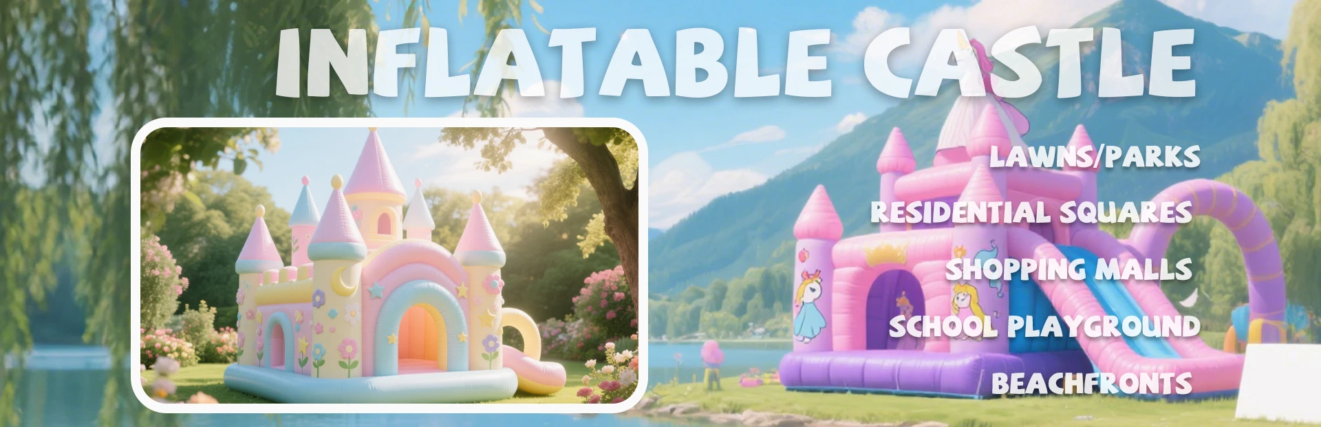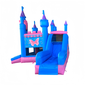 Pequeño castillo inflable de PVC con tobogán, parque infantil al aire libre y parque para niños con una pequeña piscina